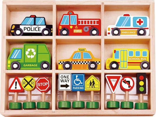 Set de Vehículos de Madera y Señales de Tránsito