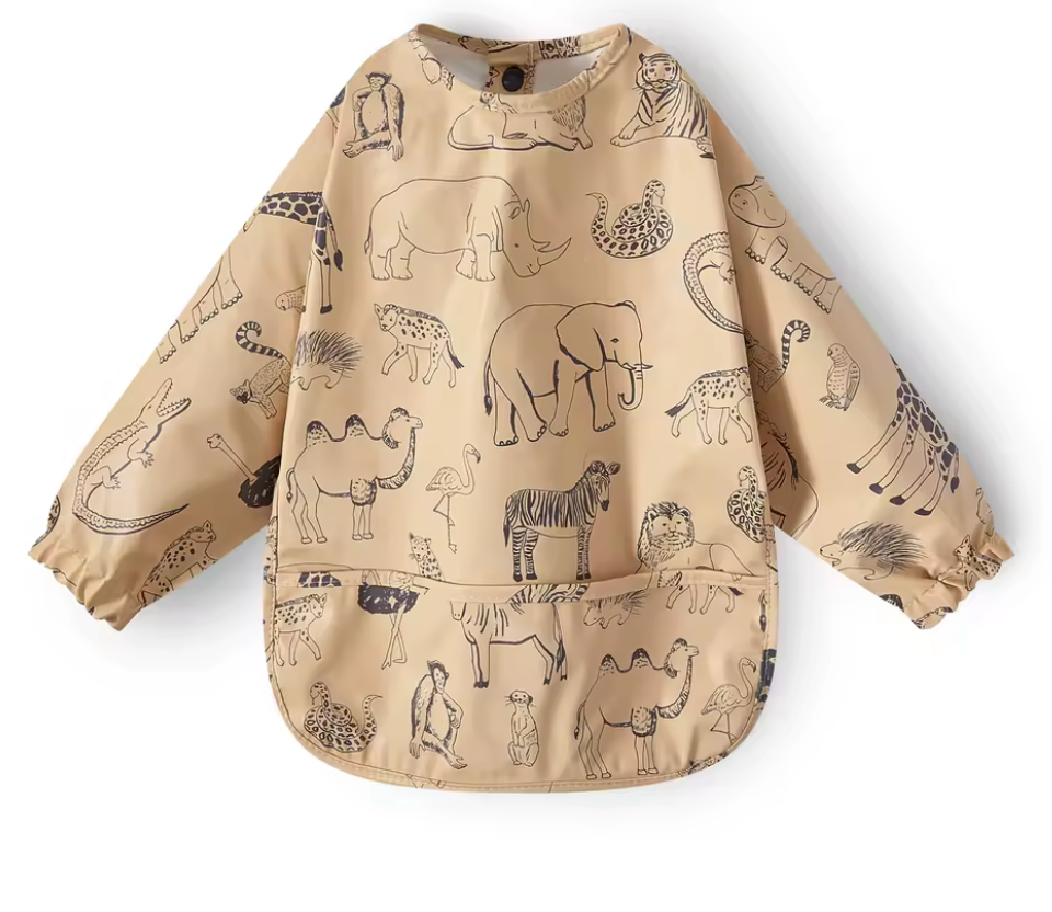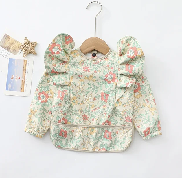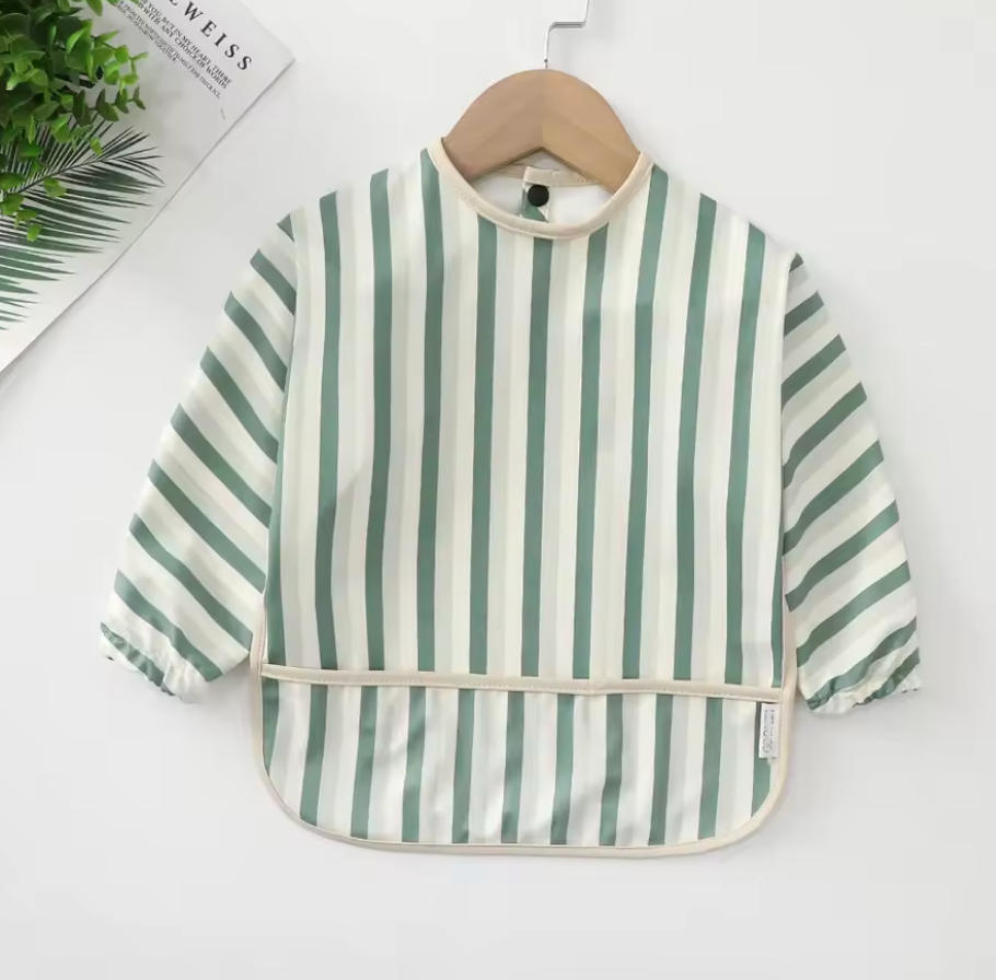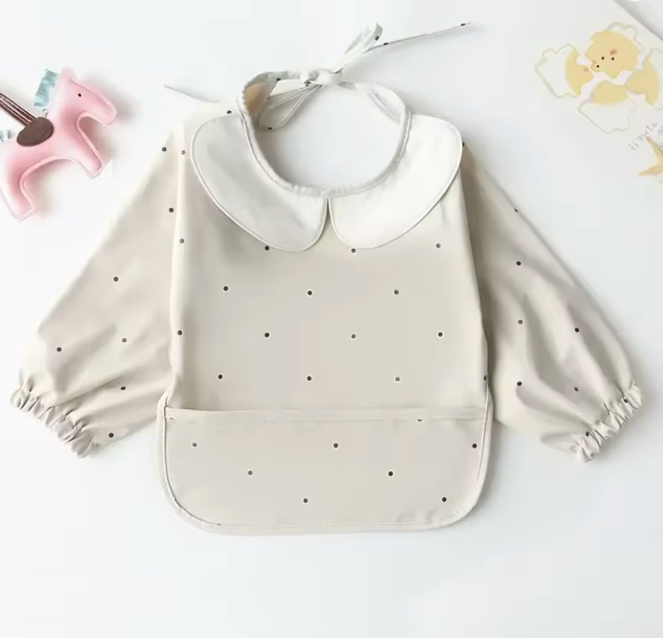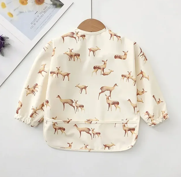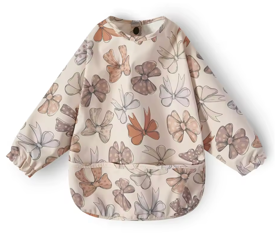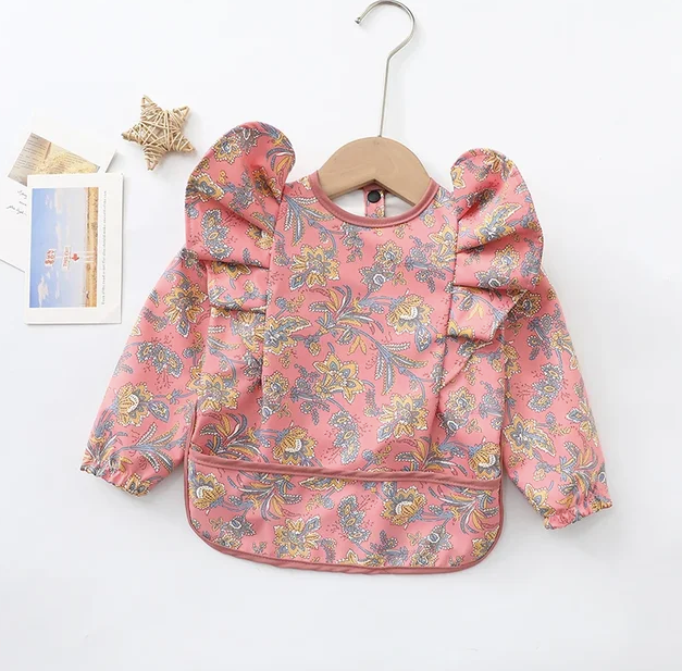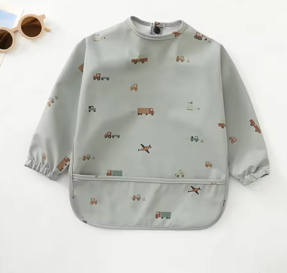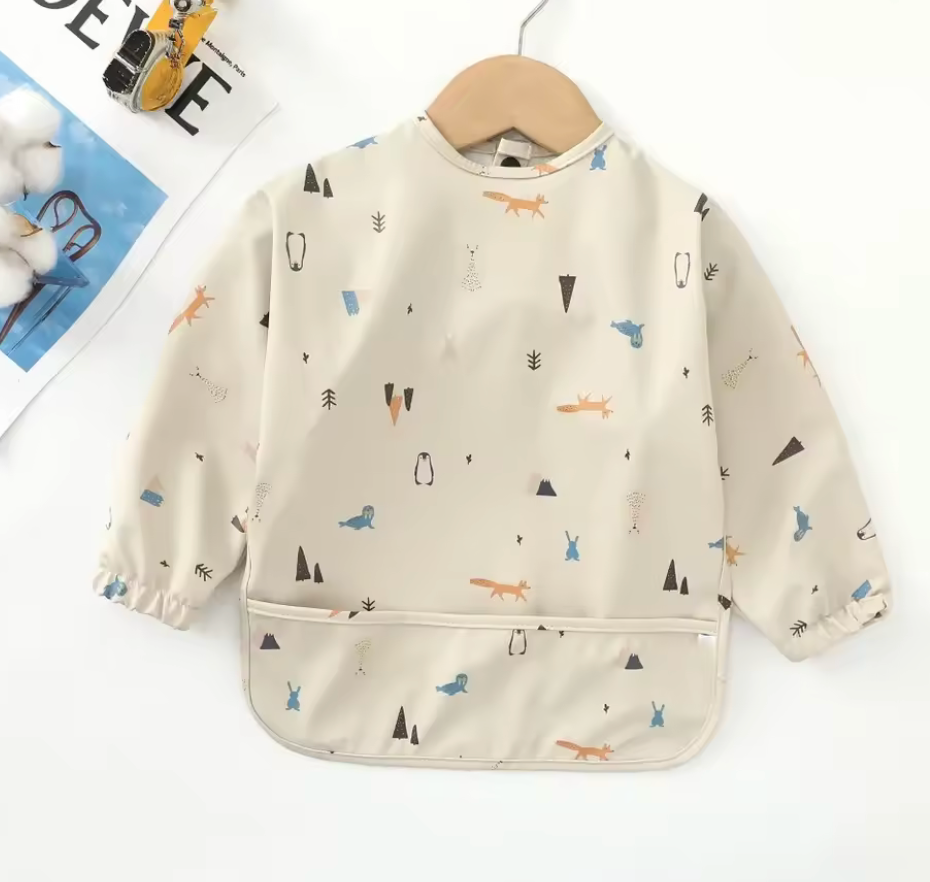 Baberos lavables de manga larga con diseños de niño, niña ,colores unisex, se abrocha por la parte de atrás, tiene resorte en las mangas para evitar que los niños se manchen. Tenemos sencillos y con olanes.