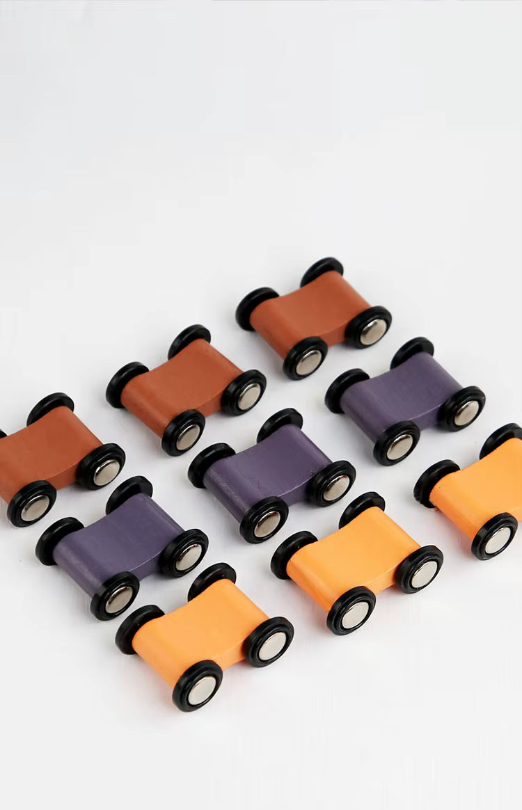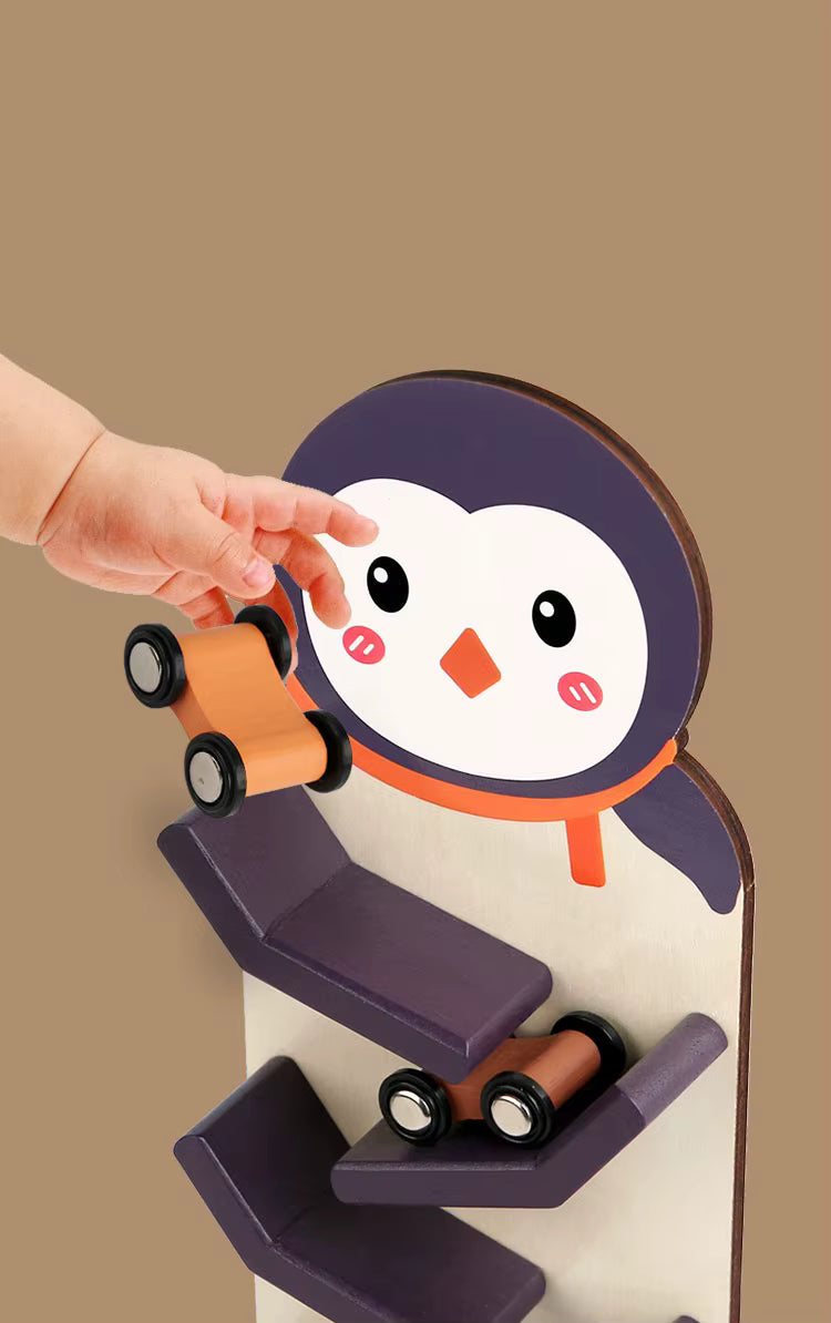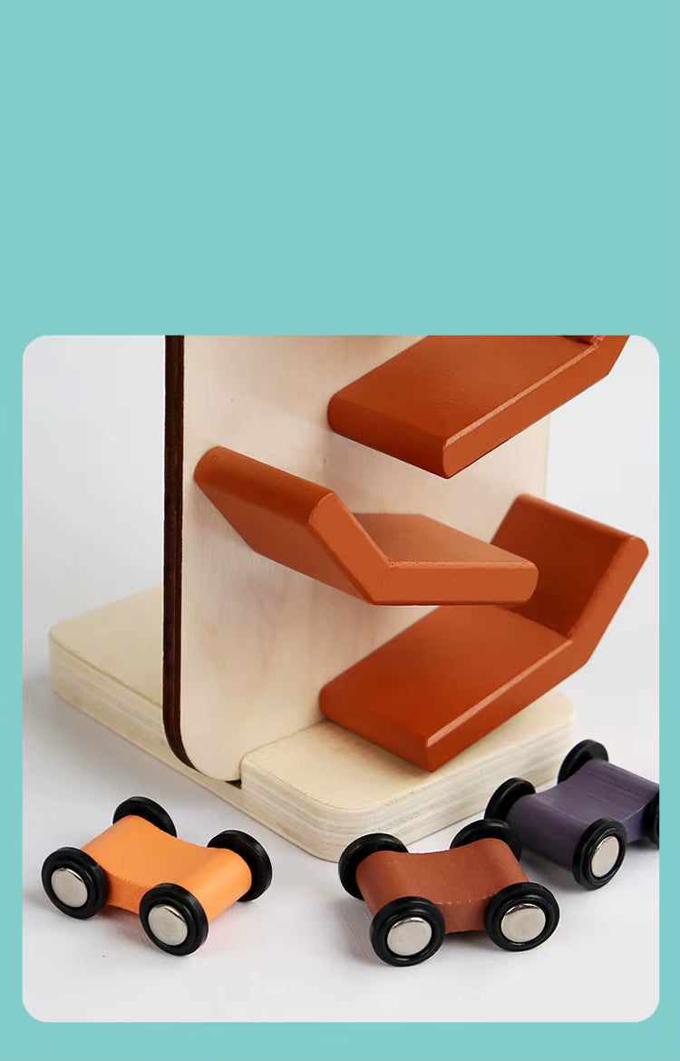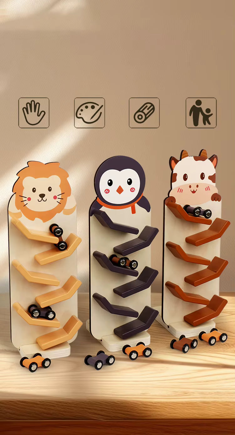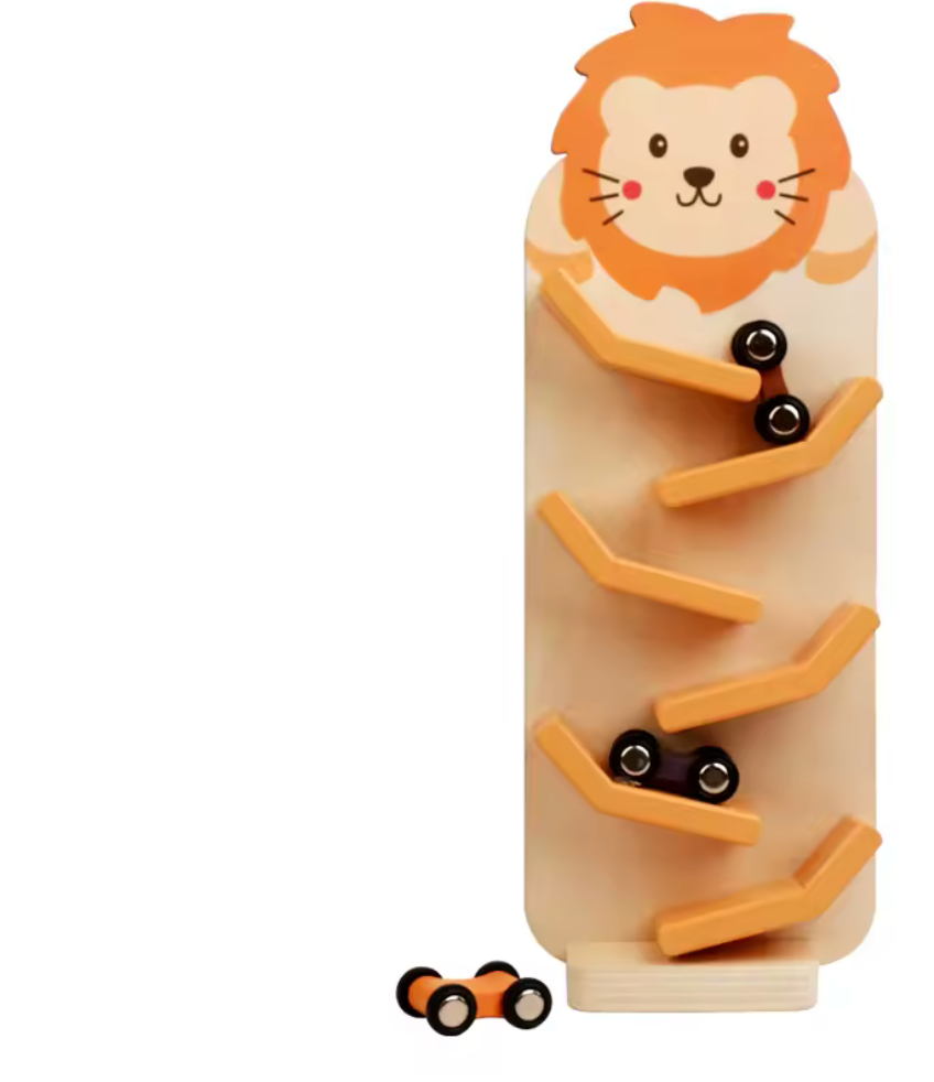 Diviértete viendo cómo los carritos bajan por cada nivel de esta colorida pista.