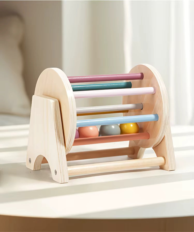 Juguete musical de madera tipo tambor rodante que incluye bolas de colores para encajar y hacer sonido mientras se empuja o gira.
