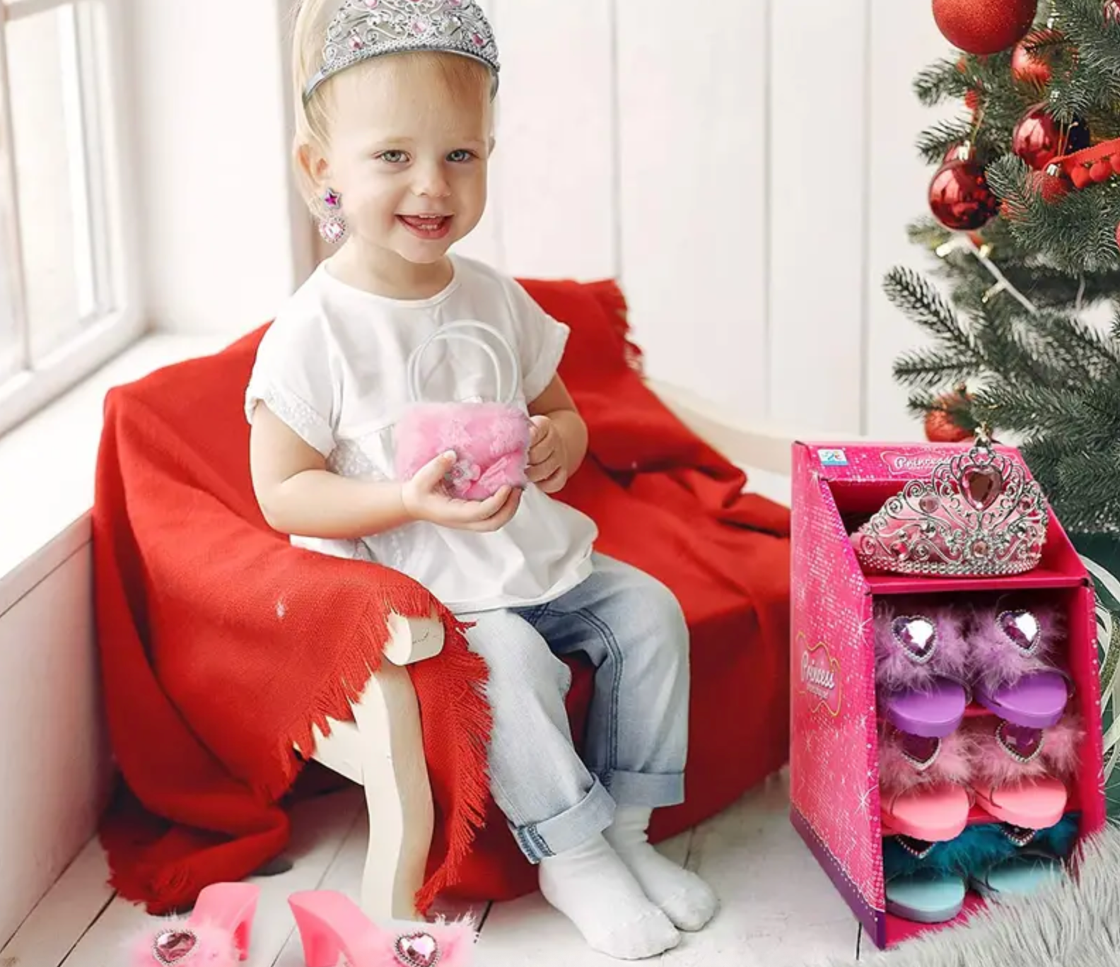Este kit incluye zapatos, coronas, anillos, aretes, pulsera y bolso, perfectos para que tu peque viva momentos de fantasía y diversión. Diseñado para fomentar el juego simbólico, la creatividad y la imaginación, mientras se convierte en la princesa de sus propios cuentos.