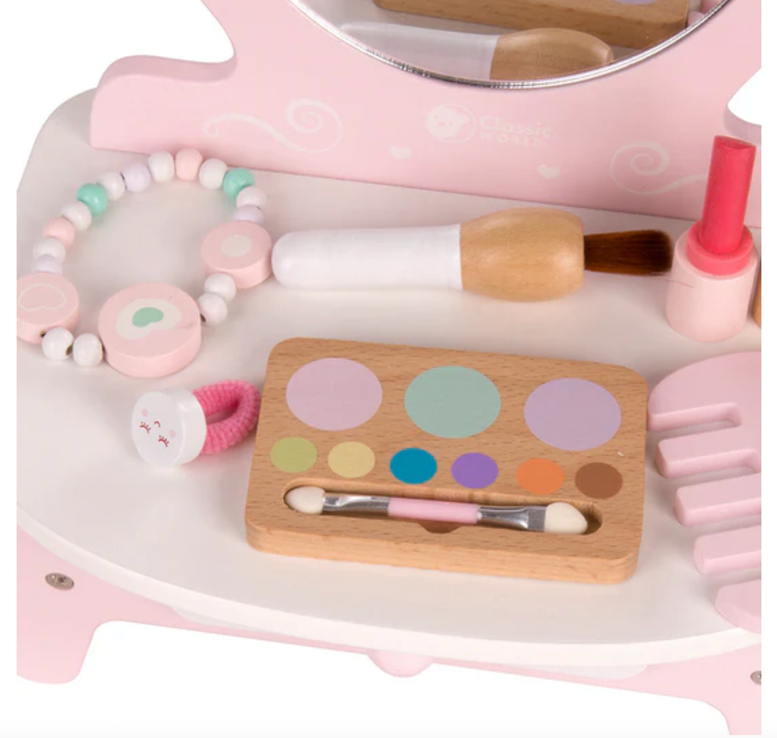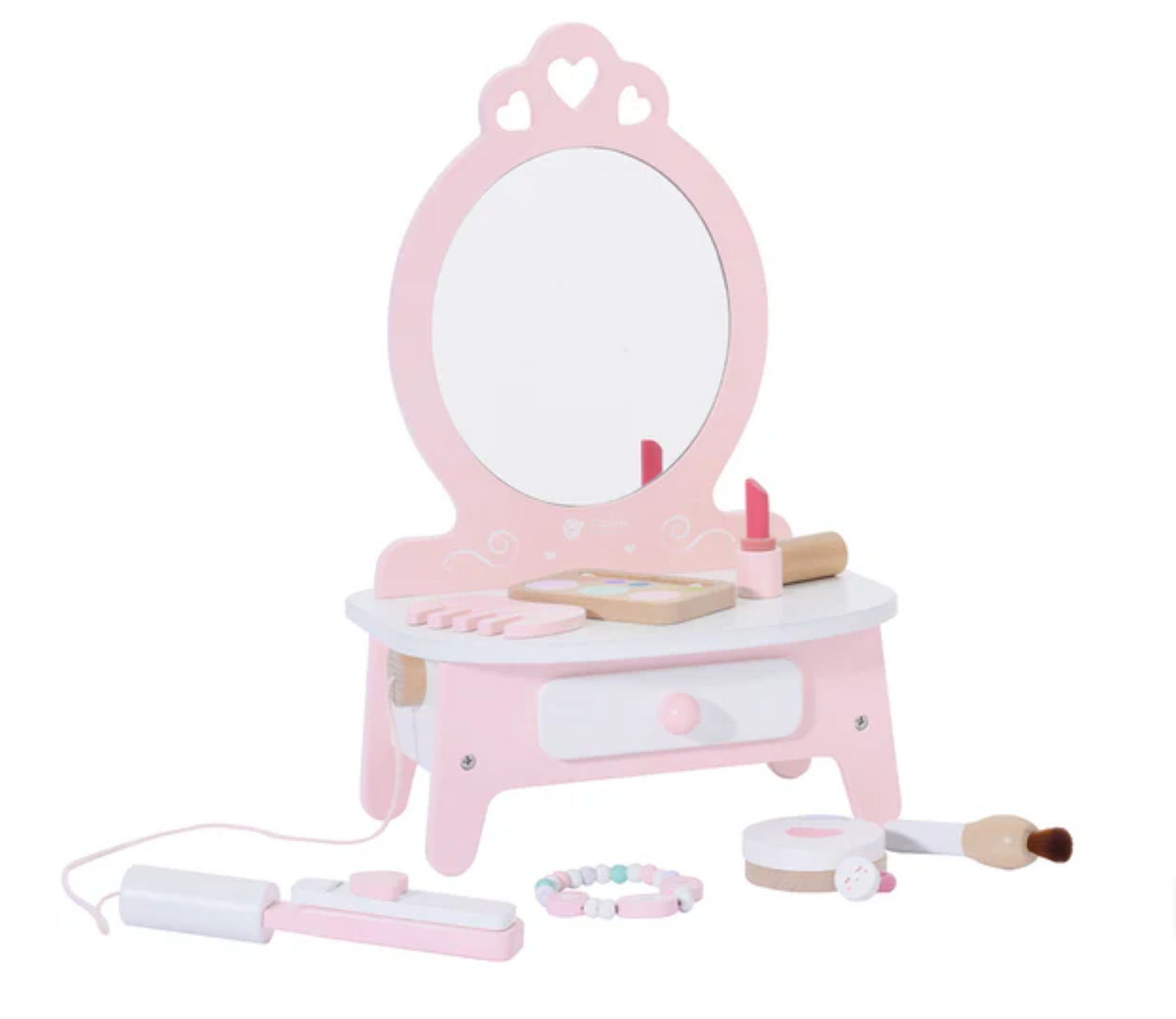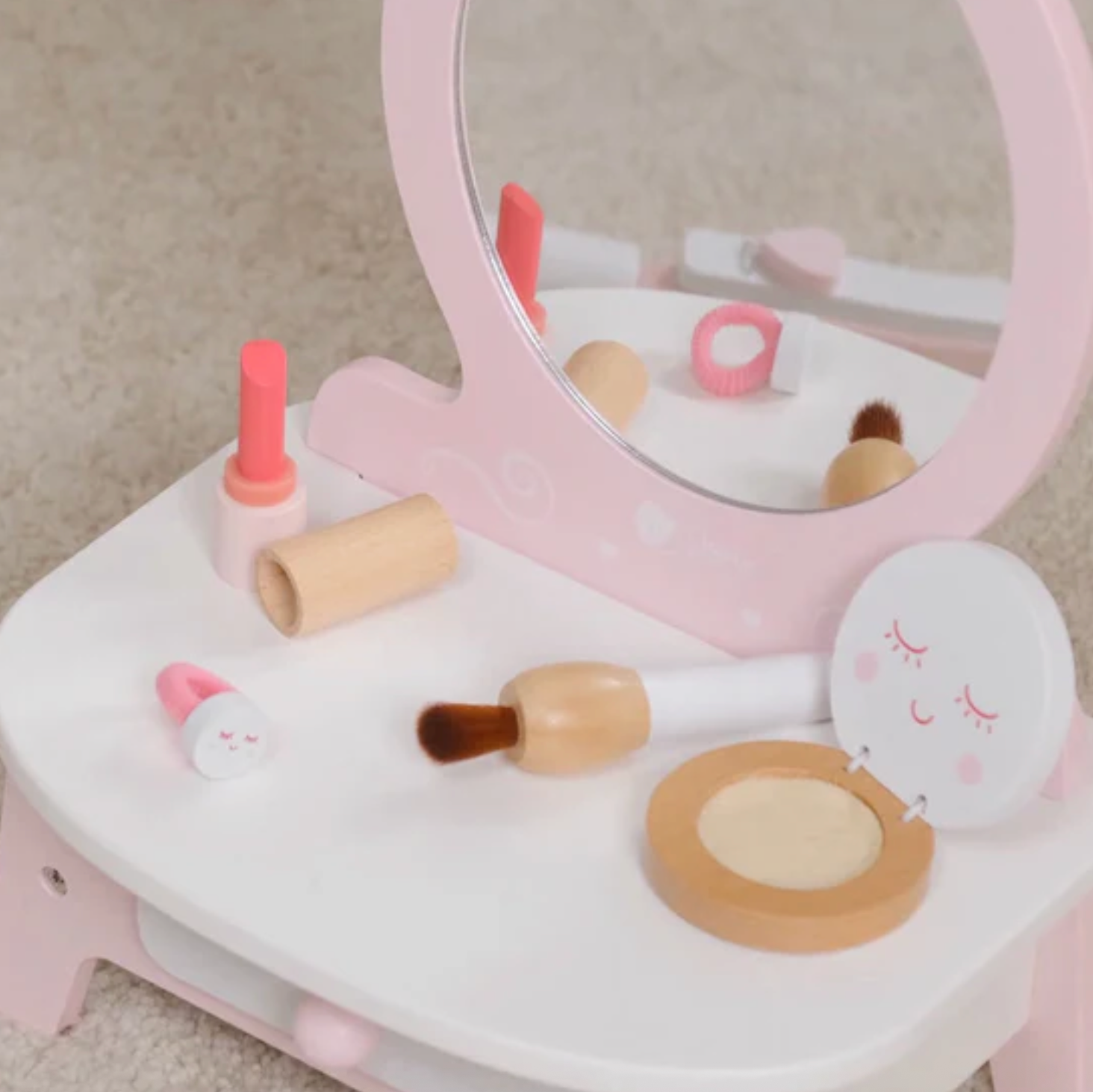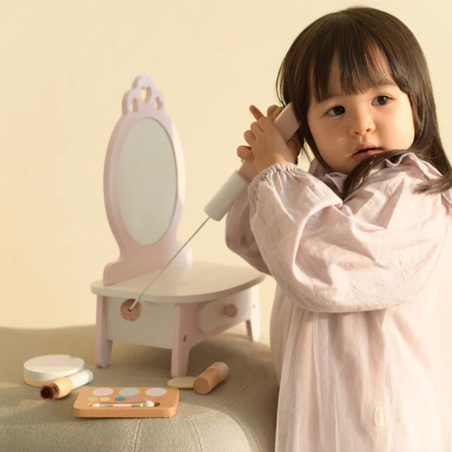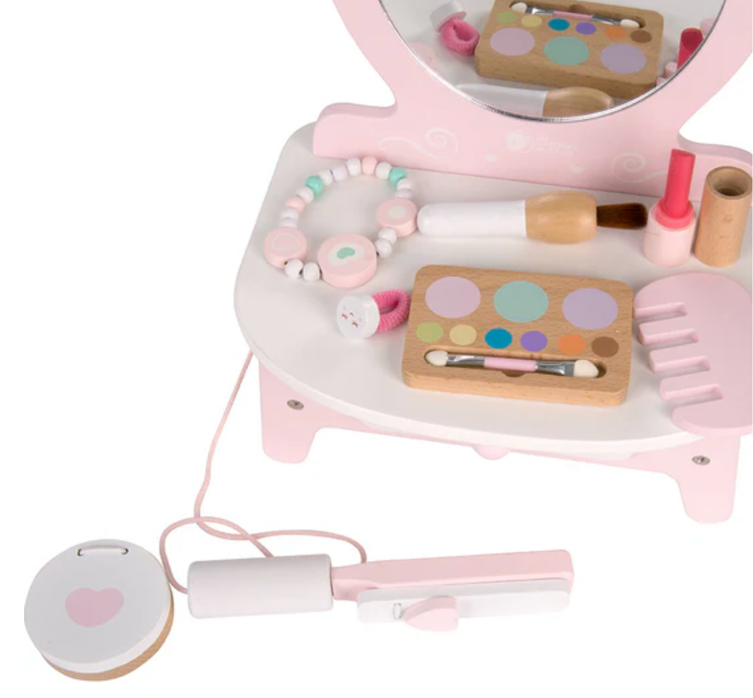 Incluye espejo seguro y accesorios de belleza de madera para que las pequeñas imaginen, creen historias y desarrollen su autonomía mientras juegan sin pantallas.